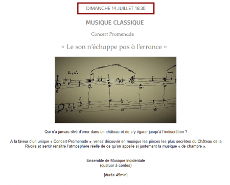 A la faveur d’un unique « Concert-Promenade », venez découvrir en musique les pièces les plus secrètes du Château de la Rivoire et sentir renaître l’atmosphère réelle de ce qu’on appelle si justement la musique « de chambre ».