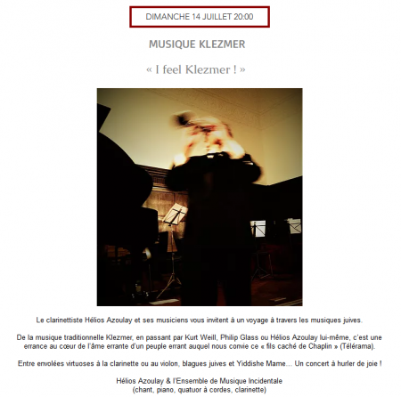 De la musique traditionnelle Klezmer, en passant par Kurt Weill, Philip Glass ou Hélios Azoulay lui-même, c’est une errance au cœur de l’âme errante d’un peuple errant auquel nous convie ce « fils caché de Chaplin » (Télérama).
