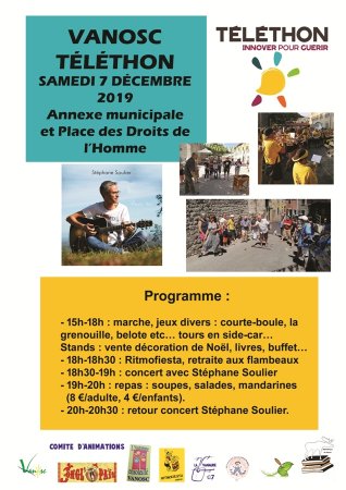 Tous les 2 ans des associations vanoscoises se mobilisent avec la mairie pour participer au Téléthon : Comité d’animation, OGEC, Amicale Laïque, La Vanaude, Automne Ensoleillé, Bibliothèque « L’élan », Jongl’Ô Païs, Ritmofiesta.Pour cette édition 2019, le chanteur réfocalien, Stéphane Soulier est venu lui aussi apporter sa contribution amicale et talentueuse.Une « partie » de l’équipe organisatrice…Avec Mélanie, Marie, Lucie et Caroline.Laura est montée dans le side car de Philippe .Le stand de l’OgecLe stand de Jongl’Ô PaïsPrestation amicale et talentueuse de Stéphane Soulier.Christophe et Guy. 3 des textes de Christophe ont été mis en chanson par Stéphane.Merci à tousLes notes toujours joyeuses de RITMO.Belote avec l’Automne Ensoleillé.