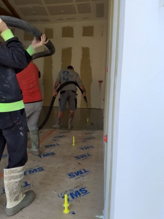 Les photos montrent le coulage de la dalle flottante qui pourra ensuite être carrelée.