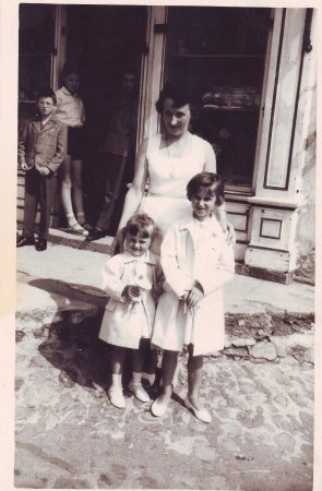 Mado, Catherine et Martine devant la Coop vers 1960