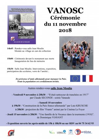 Comme de nombreuses communes de France, Vanosc a payé un lourd tribut lors du premier conflit mondial. 97 vanoscois ont en effet perdu leur vie entre 1914 et 1918. C’est pourquoi la commune s’est fortement mobilisée pour marquer le centenaire de l’Armistice du 11 novembre.La cérémonie s’est déroulée sous la présidence de monsieur le Sous-préfet en présence de monsieur Legendre directeur départemental de l’Ardèche de l’Office National des Anciens Combattants, de monsieur Guerreau représentant le Souvenir Français, de Mme Ferrand conseillère régionale, de Mme Mazet représentante du Département, d’élus vanoscois, actuels et anciens, de des membres de la FNACA, des pompiers, des musiciens, des scolaires, d’amis allemands, Isolde et Winfried, d’April et Danielle du Colorado (USA) et d’un public nombreux.Photo : PréfecturePhoto Philippe et Danielle Brunier, ainsi que les suivantes.Avec les invités allemands et américainsLouise, Maël et Céline donnent lecture du message du Président de la RépubliqueLa délégation des pompiers , avec 5 anciens.Les membres de la FNACA, avec leur président Lucien Fanget et Michel Desmartin ancien maire.