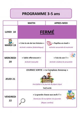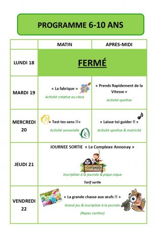 Programme du centre de loisirs des vacances d’avril