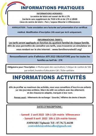 Veuillez trouver ci-joint toute la documentation utile pour le prochain centre de loisirs.