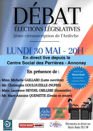Le groupe Alternatiba d’Annonay vous invite à participer au débat organisé par Radio Déclic et le Centre SocioCulturel de Tournon décentralisé en direct au Centre Social des Perrières. Il sera possible d’y suivre les échanges en direct et de poser des questions aux candidat·es.