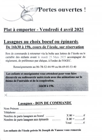 A l’occasion des portes ouvertes de notre école, nous vous proposons une vente de lasagnes.