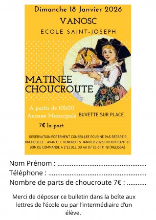 L’école St Joseph organise une matinée choucroute le dimanche 18 janvier 2026 à partir de 10h. Réservation fortement conseillée. Pour tout renseignement : 07.85.61.11.18